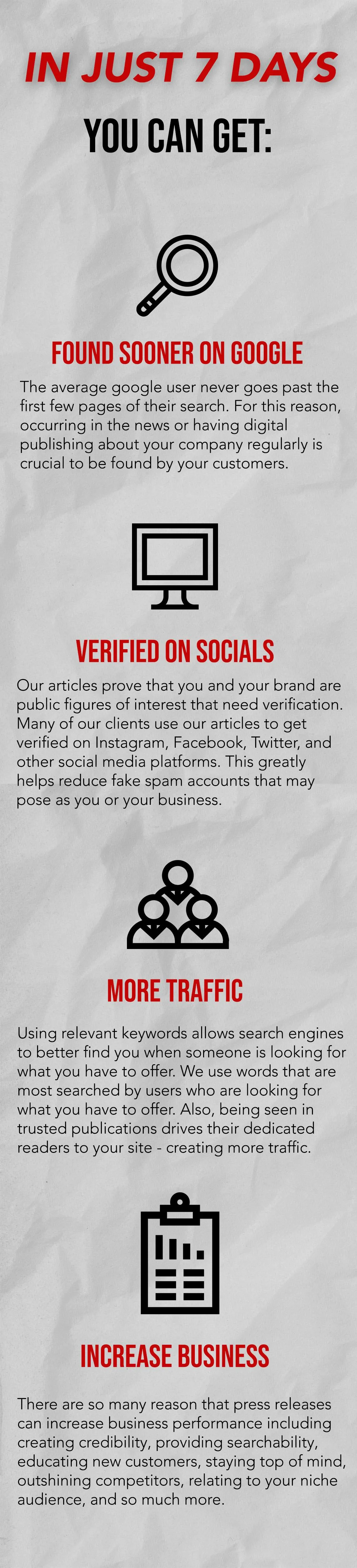 The time a feature stays on a website is determined by each news site, and Get Featured does not remove your press release at any time unless it violates our terms of service. Some news sites host them indefinitely and some will remove them after 2 years. But most sites will keep you feature live 60-90 days. You can always stay relevant with updated features. It’s very important to keep the press and your audience informed on your news with monthly or quarterly features. Join one of our subscription plans!